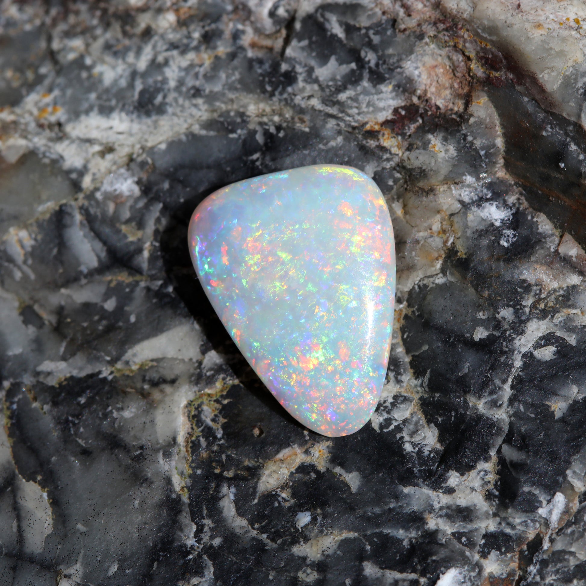 A remarkable example of Coober Pedy White Opal, showcasing a comprehensive spectrum of colour on colour, creating a captivating three-dimensional effect. This opal would undoubtedly make an exquisite pendant. Any collector would be delighted to acquire this stone for their collection.